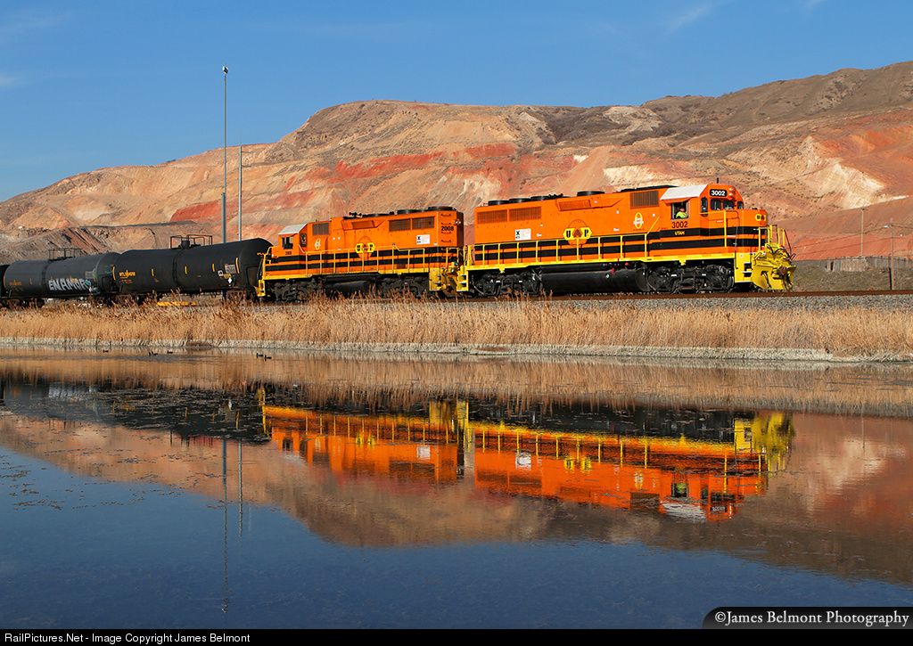 With a freshly rebuilt and repainted GP40-3 in the lead, Utah Railway's RUT311 local is reflected in Warm Springs near Salt Lake City on Feb. 26, 2016.