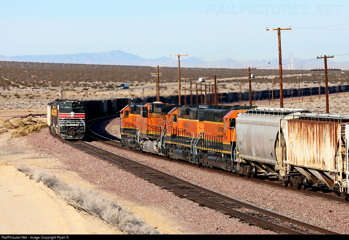 With Southern Pacific daylight red and orange up front UP's eastbound empty Trona 'coal buckets' have ducked into the siding at Jim Grey to meet BNSF's westbound Boron local, very fittingly utilizing trackage rights over the former Santa Fe between Mojave and Daggett, a line that was originally constructed by the Southern Pacific out to Needles, CA and sold to Santa Fe's predecessor (Atlantic & Pacific) in the 1890s. Obscuring the Boron's normal all second generation EMD power profile is the presence of rebuilt AC44C4M #616, BNSF 616 started life as Santa Fe C44-9W 616 but had recently been converted to AC traction with A-1-A trucks.