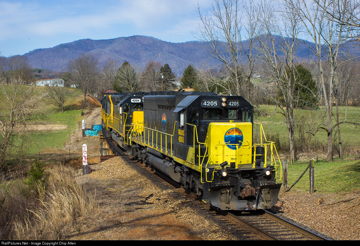 | Blue Ridge Southern's attractive herald on the nose of SD40-2 4205 fits in nicely with its background as Canton-Asheville turn T31 makes the eastbound journey to "the city up in the clouds." |