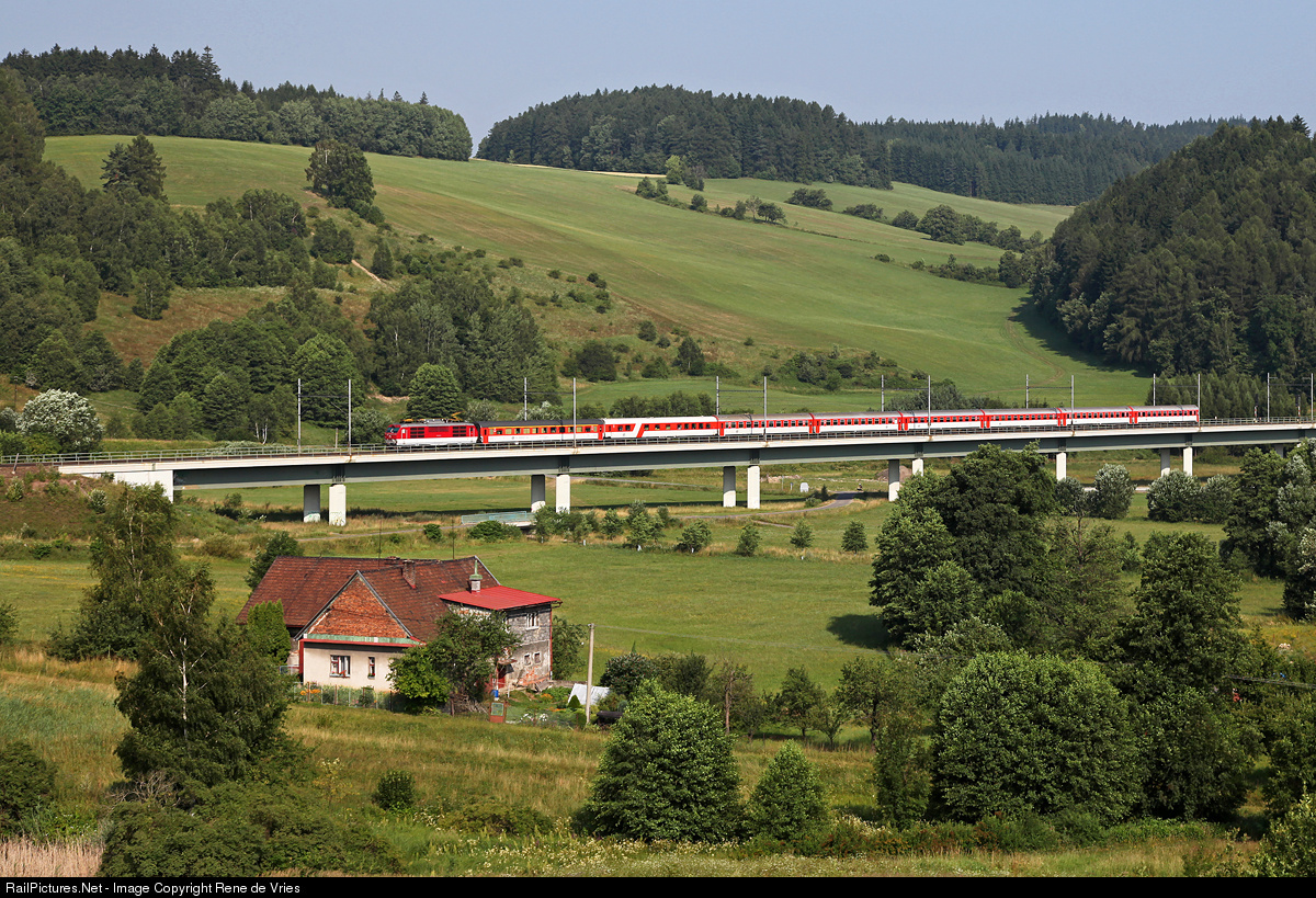 | Eurocity 273 "Jaroslav Hasek" travelling from Prague to Budpaest (via Bratislava and Vienna) is seen here at Dlouhá Trébová. |