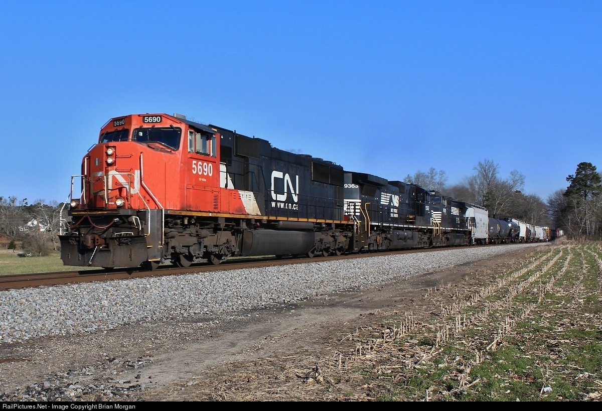 | CN SD75I #5690 leads southbound Norfolk Southern manifest train #177 through the Oostanaula Bend Loop grade crossing just south of CP "Hall", milepost 61 of NS's Atlanta North District. This location is approximately six miles south of Sugar Valley, Georgia. |