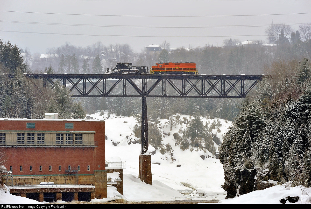 | Quebec Gatineau Plow Extra 2004 with QGRY Jordan Spreader 402876 is crossing the St-Maurice River at Shawnigan. In the foreground, Hydro-Quebec generating station #3 built in the 1940's. The railroad bridge was built by the St-Maurice Valley Railway in 1906.