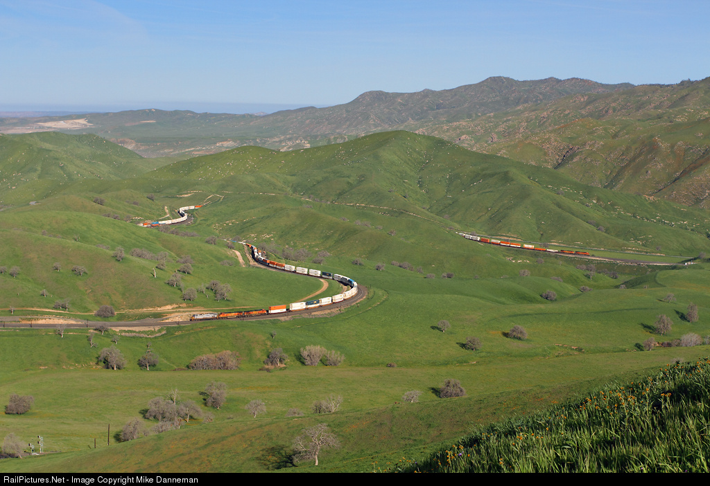 A long BNSF intermodal train climbs the 2.1 percent grade at Bealville, California, on February 24, 2016. Leading the eastbound train is CREX No. 1323 and two BNSF Dash 9s, with the head end of the train approaching Allard horseshoe. The rear of the train with two more BNSF GEs operating as a DPU is negotiating the curved fill between Tunnels 1 and 2 below on the right.