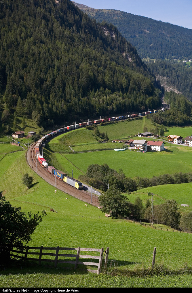| On Sept. 18th 2008, three locomotives were needed to bring a freight train to Brennero. Leading the way were ES 64 F4 - 001 and ES 64 F4 - 027, locomotive ES 64 F4 - 018 was in the back and can be seen here in the beautiful "St Jodok curve" |