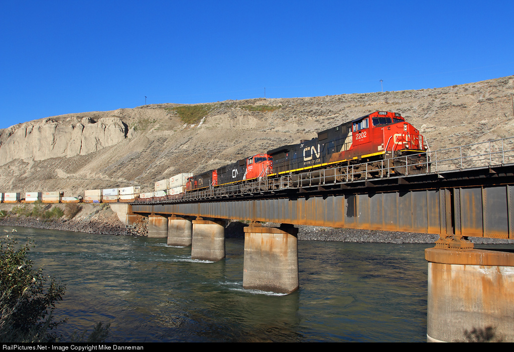 | Canadian National train No. 112 crosses the Thompson River at Ashcroft, British Columbia, on the morning of September 28, 2015. |