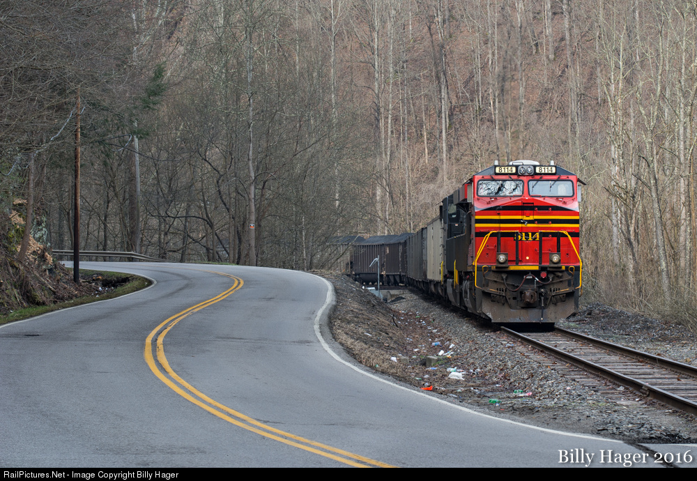 | The U14, which has spent the past 24 hours tied down at the KY Route 194 crossing at Freeburn on the Delorme Branch, waits on the crew to take the Belews Creek bound coal train East towards Bluefield. Leading the U14 is NS 8114, the original Norfolk Southern Railway heritage unit. |