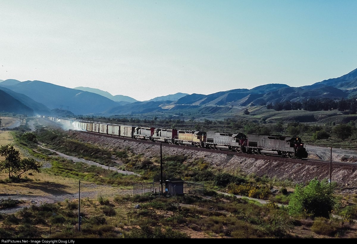 | An eastbound Southern Pacific train exits Cajon Pass and adds more of the ubiquitous Cajon brake shoe smoke to the atmosphere of Devore, California. |