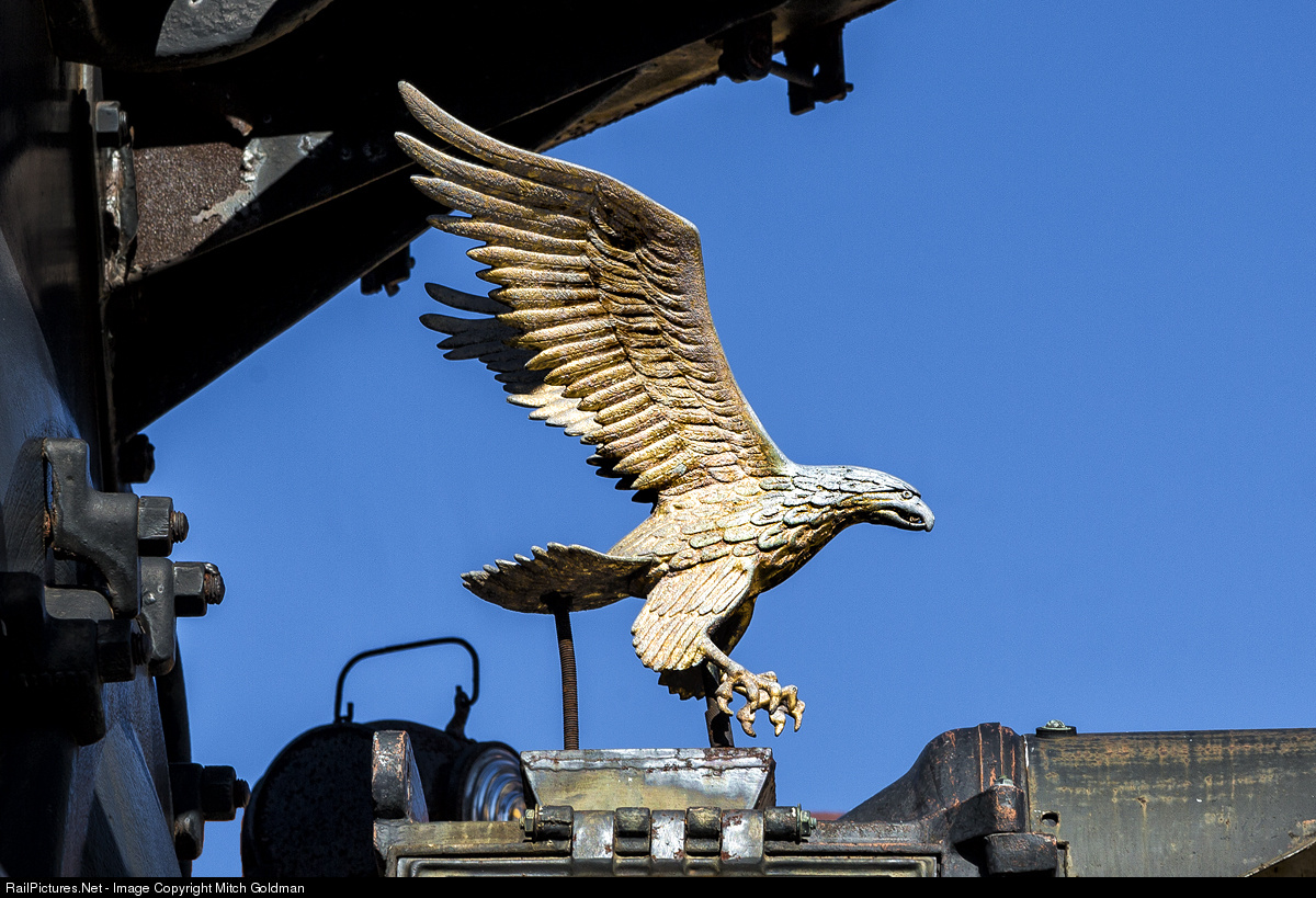 RDG #2101 toured the eastern portion of the United States as the "American Freedom Train" between April 1, 1975 to September 1976. When relieved by SP #4449 in Chicago in July of 1975, the engine received a new and improved livery which included not only the Great Seal of the United States, but also this golden eagle. The patriotic eagle remained on the engine throughout the rest of the tour and on through the Chessie Steam Special excursions. Today, the engine sits on display, outdoors in the parking lot of the B&O Railroad Museum in Baltimore, MD.