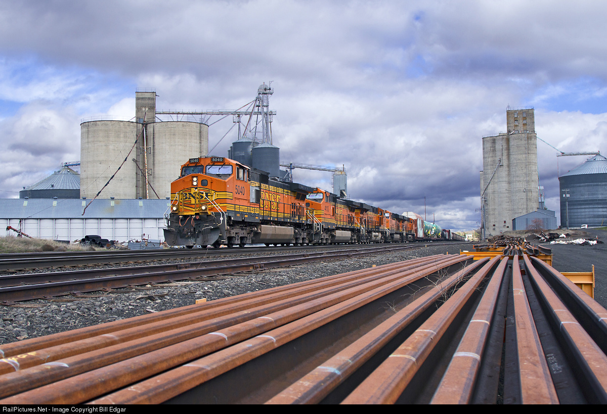 A quintet of GEs supplies 22,000 HP to keep the SPOEVE ahead of a Z train at Harrington, WA. Running about 10 minutes ahead of the Z, today's SPOEVE has the unusual feature of carrying two Boeing 737 fuselages toward Wenatchee and Seattle. My normal experience is they place these on vehicle trains. The Z will overtake this train west of Odessa, WA.
