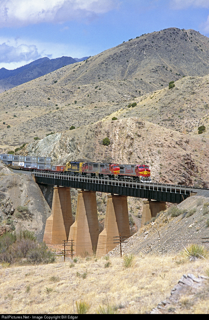 Two Santa Fe Superfleet units lead a BNSF GP60M and a blue and yellow hood unit east into Abo Canyon with a Maersk stack train. The GP60M gives away the fact it is now BNSF, but for the moment we can relish the Santa Fe one more time on a cool April morning in the New Mexico desert.