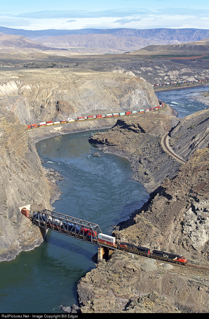 A CN westbound stack train headed for Vancouver with export containers snakes through Black Canyon, pops out of a curved tunnel and over the Thompson River. CP's main is to the right.
