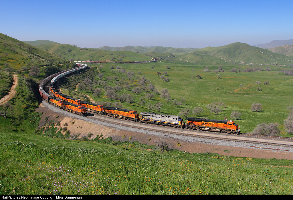 Orange with a touch of gray A westbound BNSF grain train holding the main line at Bealville, California, meets an eastbound BNSF intermodal train on February 25, 2016. The two DPU locomotives, along with nine on the point of the intermodal are all GEs dressed in orange, with the exception of CREX No. 1205.