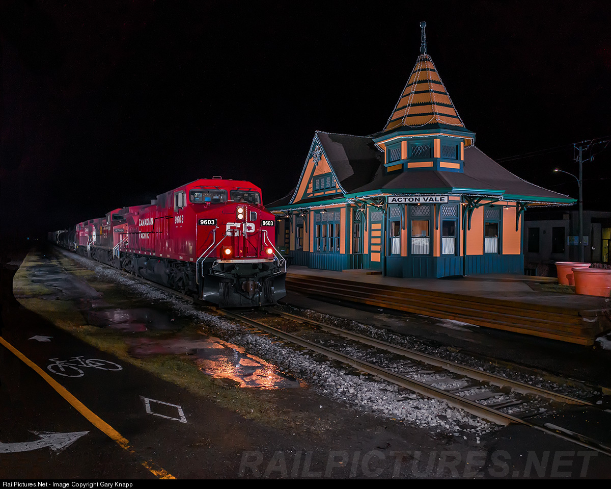 The wonderfully restored ex-Grand Trunk station in Acton Vale hosts the nightly appearance of CN 393 with freight off the Saint Lawrence & Atlantic at Richmond, Quebec. Probably thee last locomotives I expected to see here, a trio of Canadian Pacific GEs comes by the station at 00:35 with a (gasp!) CLEAN leader!