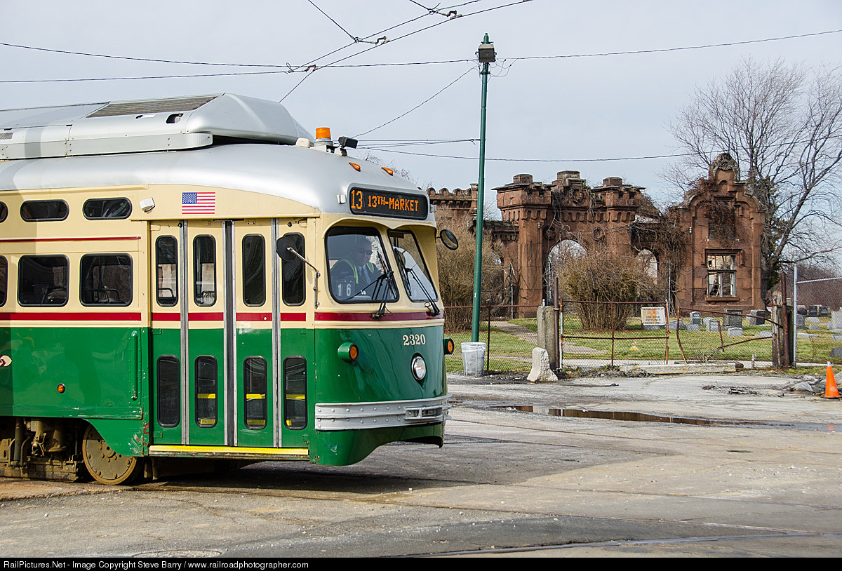 | The derelict gate house to Mount Moriah Cemetery stands guard as PCC-II No. 2320 pauses for photos as part of Super Saturday Streetcar Special XXIII sponsored by the Wilmington Chapter NRHS. Operator Russell Greco patiently awaits the all-clear signal to open the doors for reboarding. |