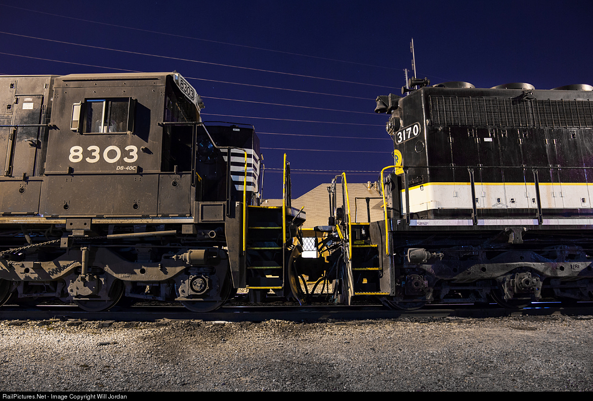 | Southern vs Conrail Southern 3170 sits coupled to former Conrail D8-40C, NS 8303, at the Gainesville Depot awaiting future assignment. |
