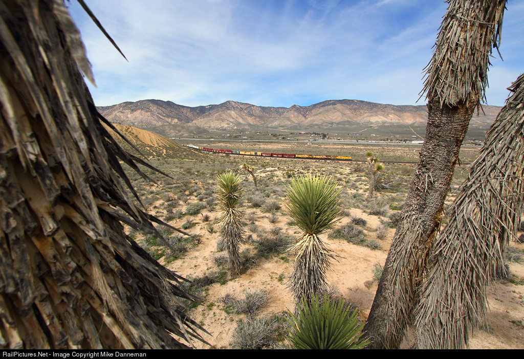 Framed by Joshua trees, an eastbound Union Pacific manifest freight passes milepost 375 at Warren, California, on February 28, 2016.