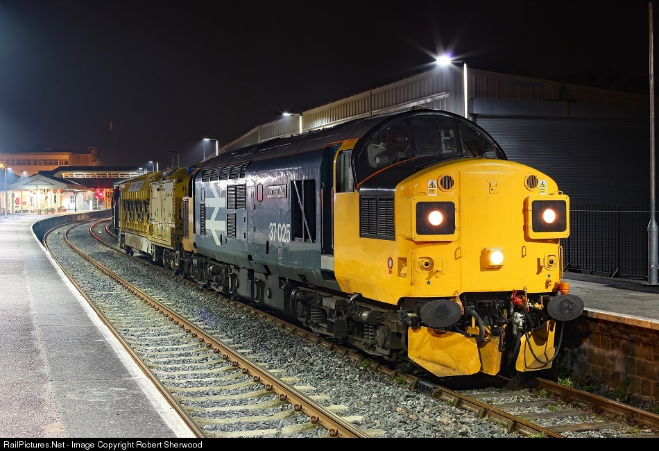 | 37025 and the Railvac briefly stop at Paignton while working an early running 6X54 21:06 Exmouth Junction to Goodrington CHS on Saturday 12th March 2016 |