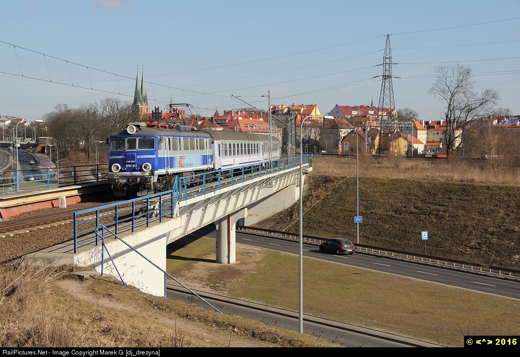 TLK Gryf from Olsztyn Główny to Szczecin Główny is just at the beginning of its trip. Now the train is over the Schumana Street after the Olsztyn Zachodni passenger stop.