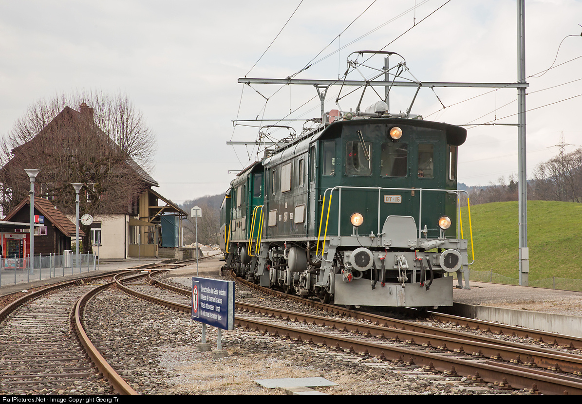 Round trip through eastern part of Switzerland, with 2 dining cars and locomotives Be 4/4 # 15 and # 11, both former Bodensee-Toggenburg Bahn (BT) from 1931 (SLM and SAAS). # 15 is running for the Dampfbahnverein Zürcher Oberland (DVZO), # 11 is privately owned and based in Winterthur.