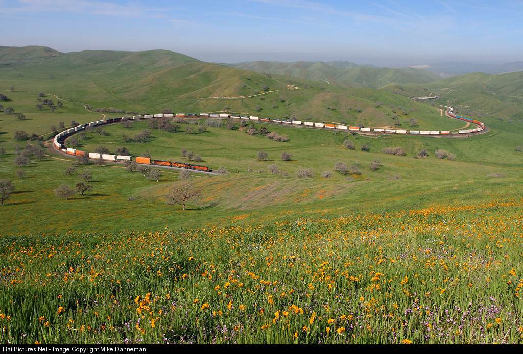 On Tehachapi Pass, covered in beautiful spring green grass, an eastbound BNSF intermodal train climbs the 2.1 percent grade through the Allard Horseshoe curve at Bealville, California, on February 26, 2016.