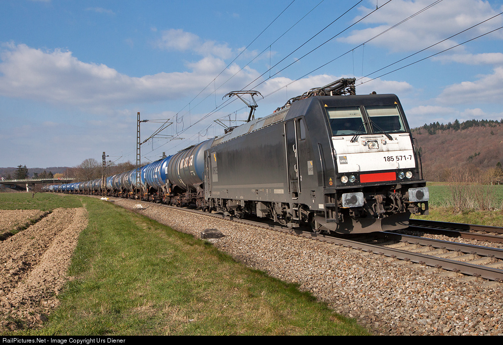 SBB Cargo 185 571, leased from MRCE Dispolok, is leading an southbound tank train.