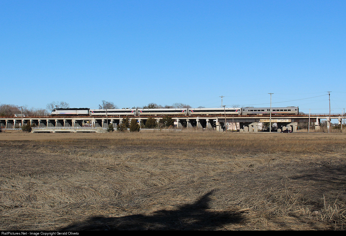 | A westbound Atlantic City Line train to Philadelphia slows for its first station stop at Absecon. The train is seen crossing the 1939 Pennsylvania Reading Seashore Lines viaduct spanning Absecon Creek and Shore Road. This structure was part of a grade crossing elimination project through Absecon at the time. |