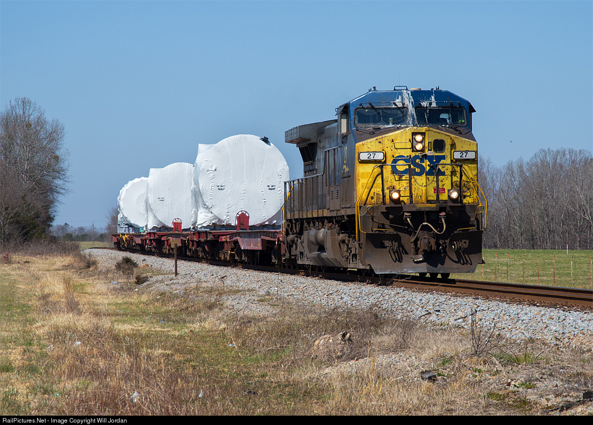 | Ratty looking CW44AC, CSX 27, leads a load of three large gas turbines south on the CSX CN&L Sub past some farms just south of Clinton, SC. |
