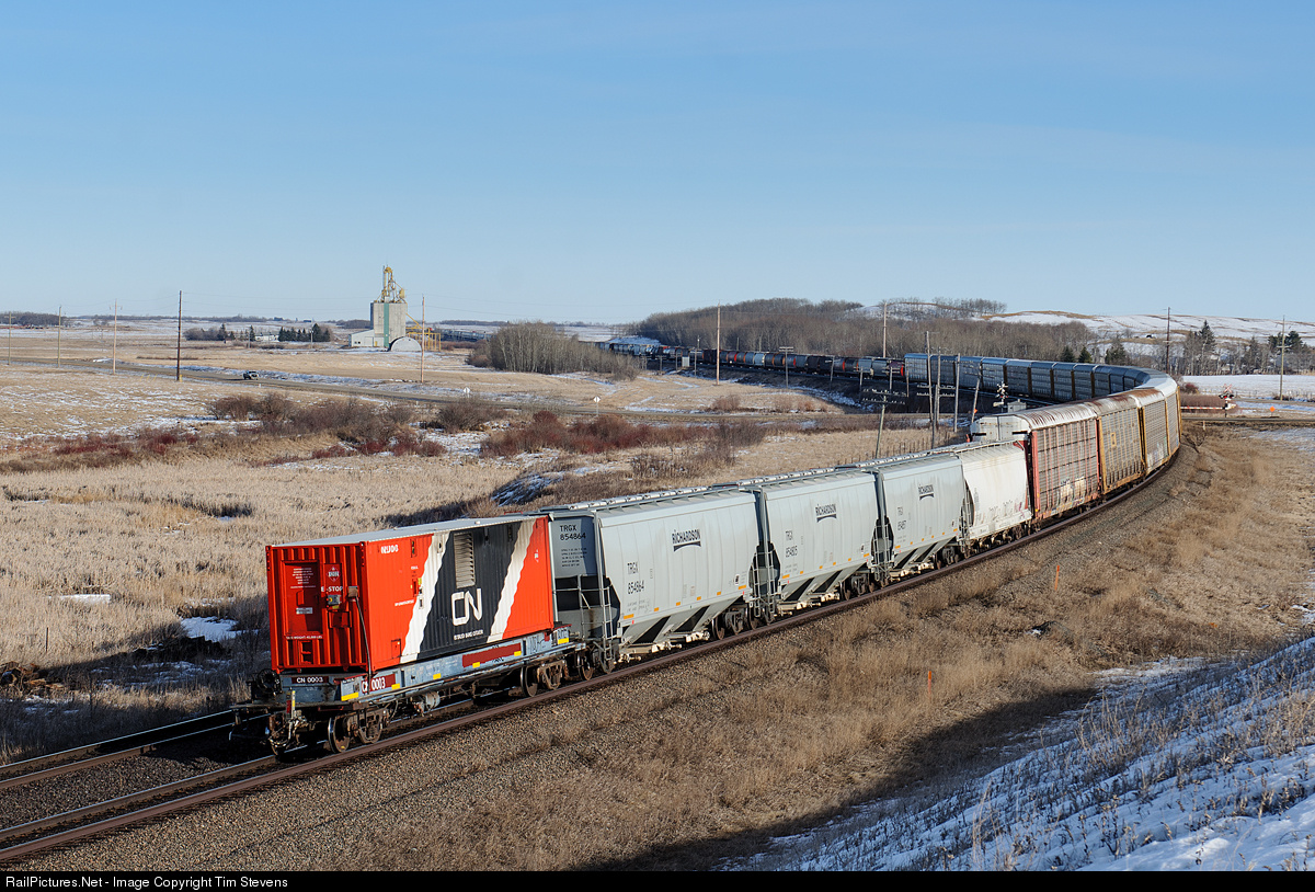 Bringing up the rear of CN A404 on this day was "CN 0003", a distributed braking car. A CN container with a generator inside has been placed on an old steel coil car to assist with the air flow throughout the train in the cold winter months.
