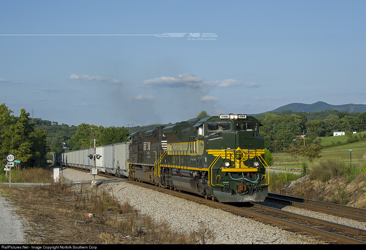 The Erie heritage unit, SD70ACe number 1068, leads a train of new hopper cars uphill through Singer, Virginia. The hoppers were built in Roanoke and are heading west to be placed into revenue service. Photo by Casey Thomason. For more information about Norfolk Southern, visit www.nscorp.com