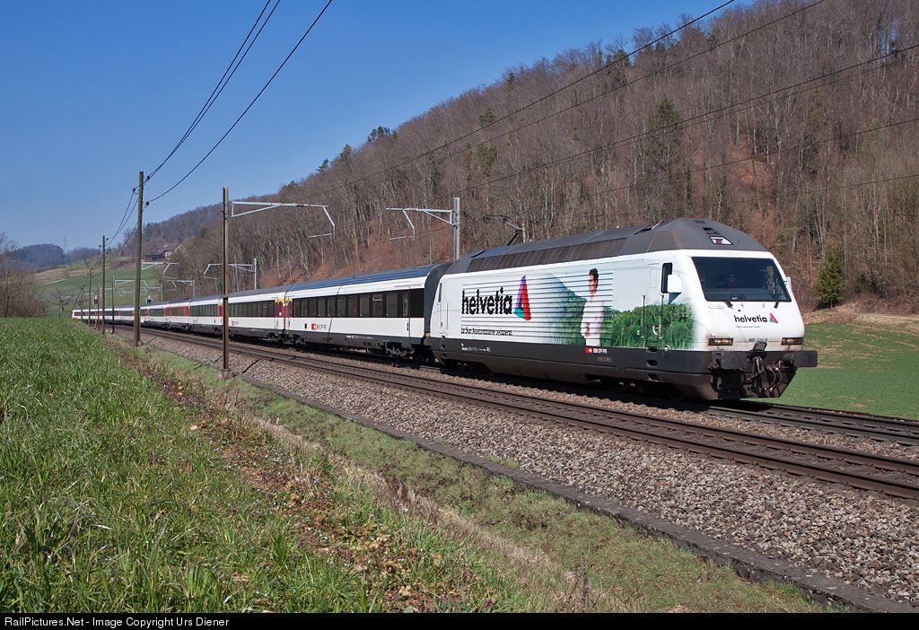 | The SBB Re 460 035, painted in the publicity paint scheme for the insurance company Helvetia, is leading IC 571 from Basel to Chur. |