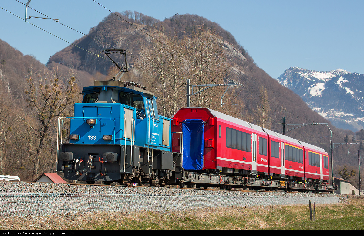 | Electric locomotive with aditional accumulator battery for shunting, Eea 936 # 133 of Stadler Rail, is pulling 4 lowfloor cars with the first half of the second "Albula Glieder Zug" (AGZ, Articular trainset for the Albula line) for the Rhaetian Railway, from the Stadler works in Altenrhein to Landquart. |