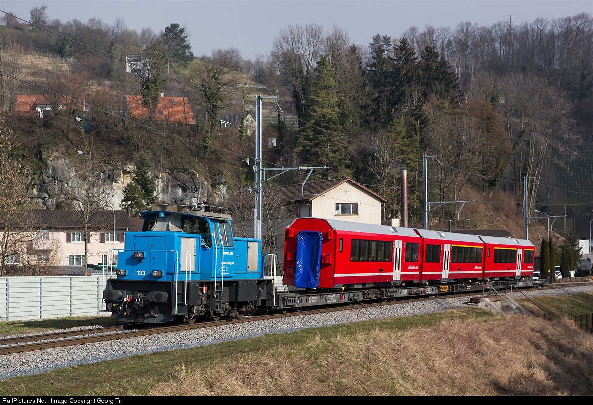 Electric locomotive with additional accumulator battery for shunting, Eea 936 # 133 of Stadler Rail, is pulling 4 lowfloor cars with the first half of the second "Albula Glieder Zug" (AGZ, Articular trainset for the Albula line) for the Rhaetian Railway, from the Stadler works in Altenrhein to Landquart.
