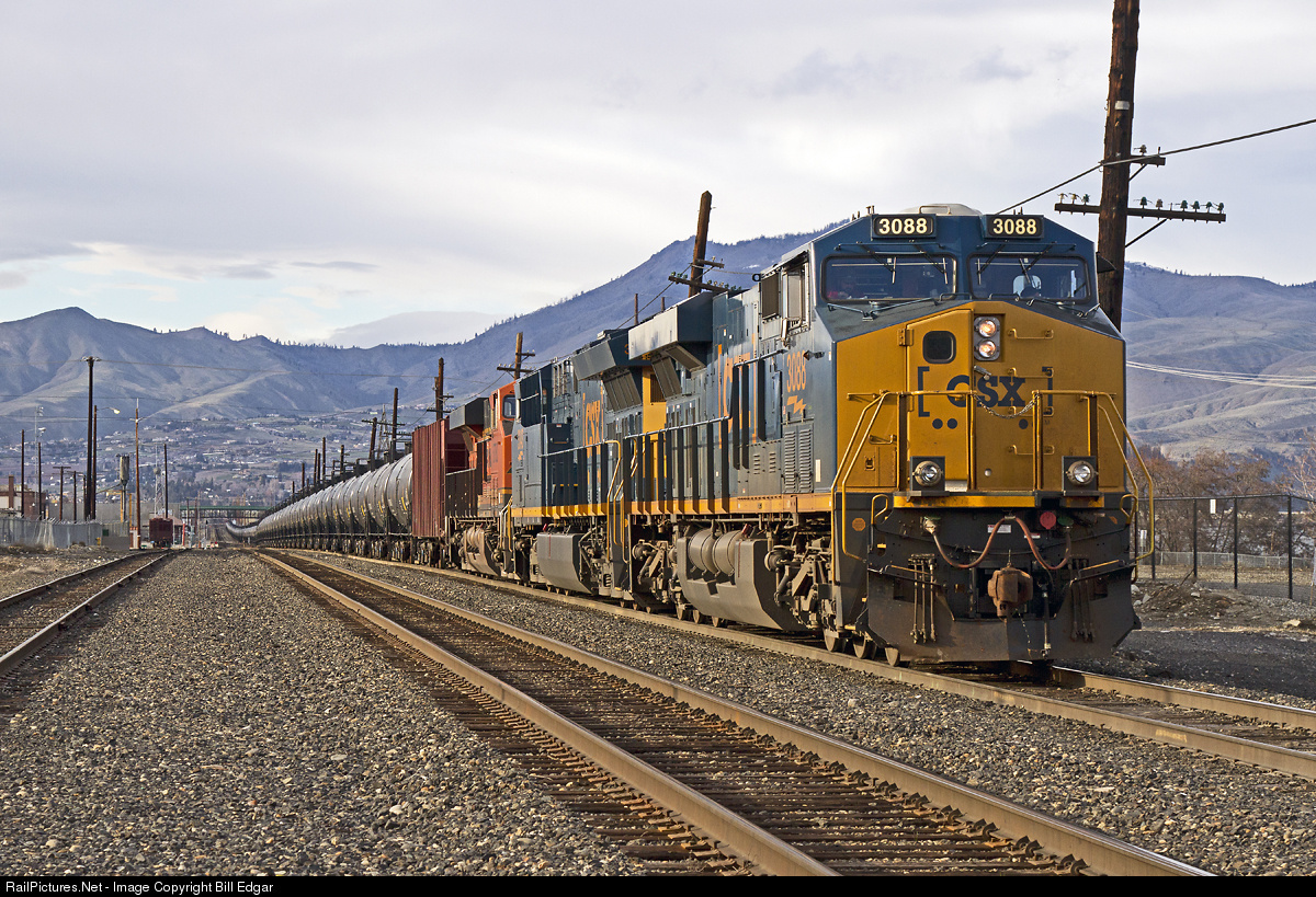 | CSX 3088 heads up the second of two eastbound trains held up at Wenatchee for track work being done at Adrian, WA about 60 miles east. This empty oil train and an eastbound stack train waited for five westbounds which included two Z trains, a manifest and two stack trains to get into or through the terminal. |