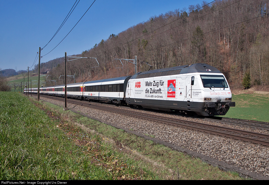 | The SBB Re 460 052, painted in the publicity paint scheme for ABB (Asea Brown Boveri Ltd.) / Gottardo 2016, is leading IC 1073 from Basel to Interlaken Ost. |