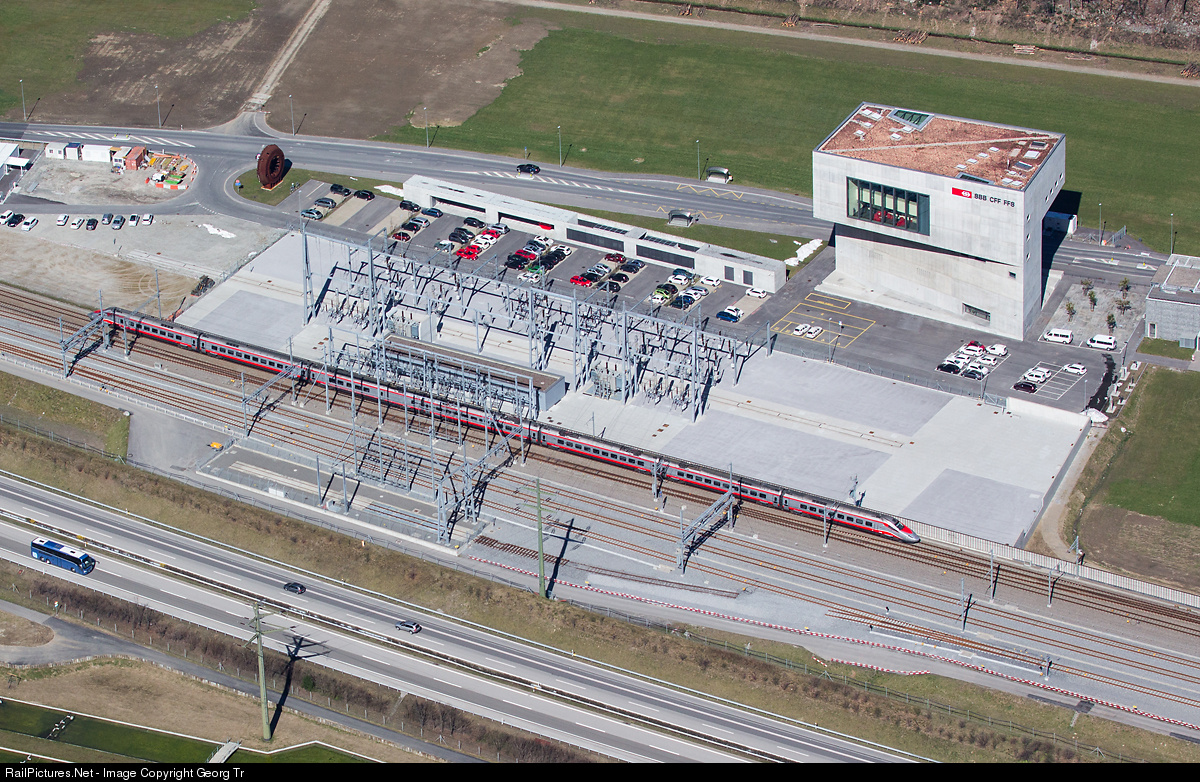 Highspeed tilting train ETR 610 of Trenitalia is running as Eurocity 17 from Zürich to Milan and passing a "modern signalbox" or interlocking tower, the operation center south (BZ Süd/Betriebszentrale Süd) of the SBB in Pollegio, and the substation. The train is running on the double track of the Gotthard mountain line, parallel in the foreground is the double track of the future Gotthard Base Tunnel (GBT) line and a passing track, just ending here. From the dispatching center Pollegio are dispatched, operated and supervised the whole Gotthard line from the italian border in Chiasso and Ranzo-San Abbondio (Luino line), and Locarno, in the south, to Arth Goldau (including) in the north, and the new Gotthard Base Tunnel and the Ceneri Base Tunnel (from 2020).