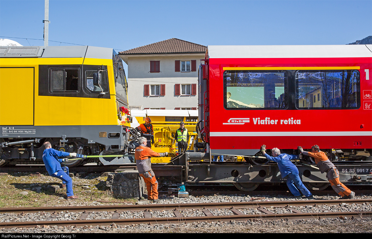 New Albula Glieder Zug (AGZ, Articular train for the Albula line) for the Rhaetian Railway is onloaded from the standard gauge lowfloor cars to the 1 meter gauge, where diesellocomotive Gmf 4/4 # 23404 is waiting.