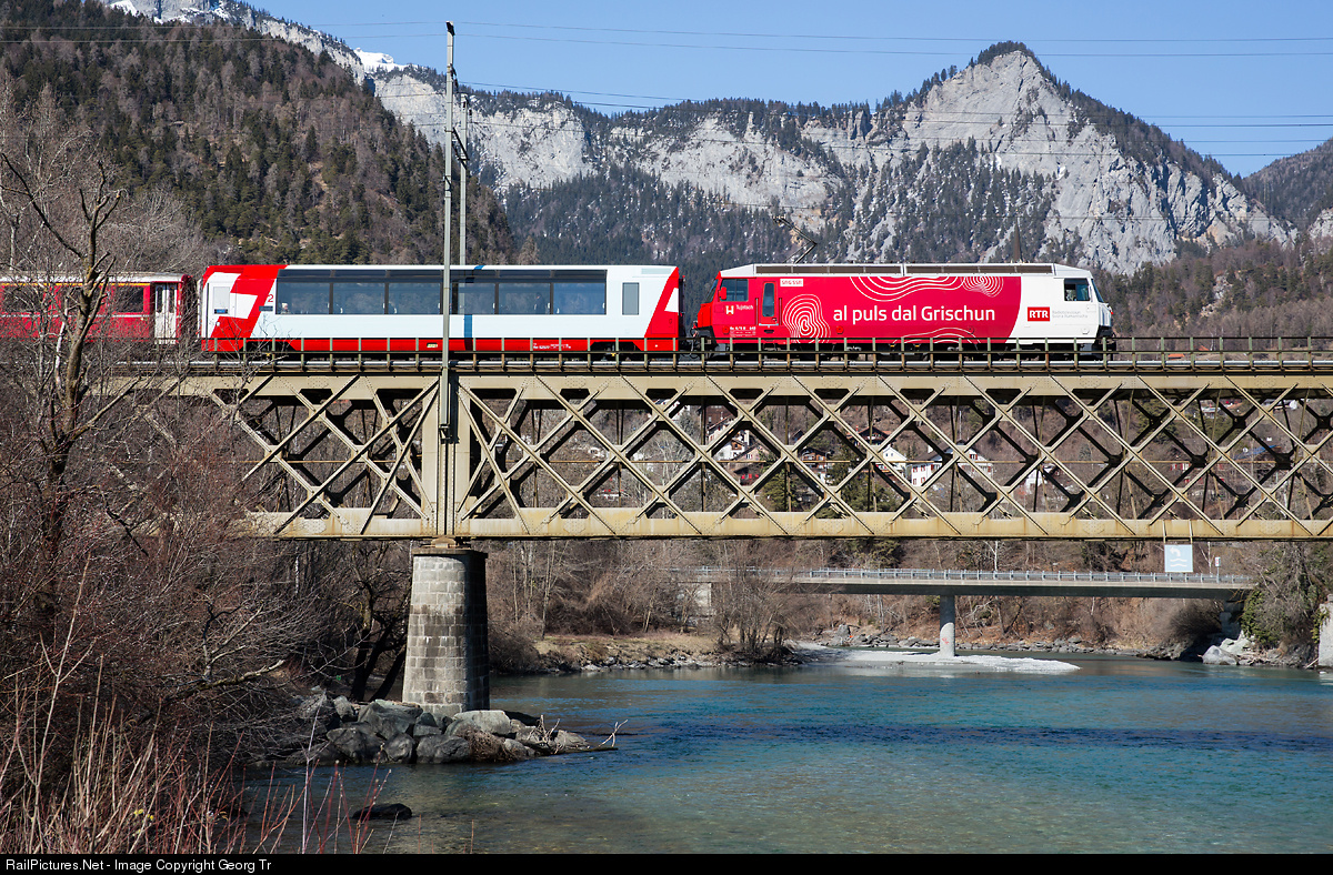 | Ge 4/4 III # 645 "Tujetsch" has a new paint scheme for Radiotelevisiun Svizra Rumantscha (RSR, Swiss Broadcast and TV for the Romansh speaking part of Switzerland). She is pulling Regio Express 1140 from St.Moritz to Chur over the 151 meter long Hinterhein bridge in Reichenau-Tamins. Behind the locomotive a "Glacier Express" panorama car, surplus in wintertime. Just behind the bridge, the Vorder- and Hinterrhein rivers confluence and then ar called Rhein (rhine). |