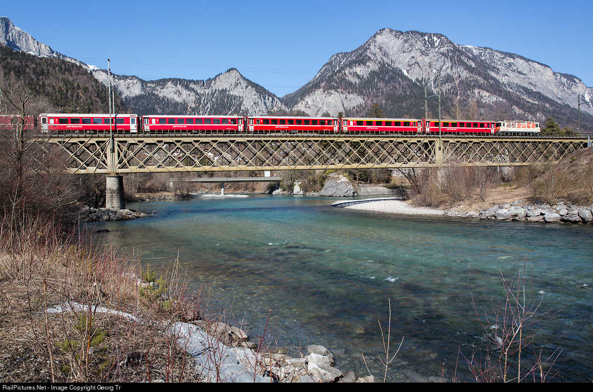 Ge 4/4 II # 622 in the "Hakone Tozan Railway" paint scheme with train 1736 from Disentis to Scuol on the 151 meter long truss bridge over the Hinterrhein (Hinter Rhine) in Reichenau-Tamins.