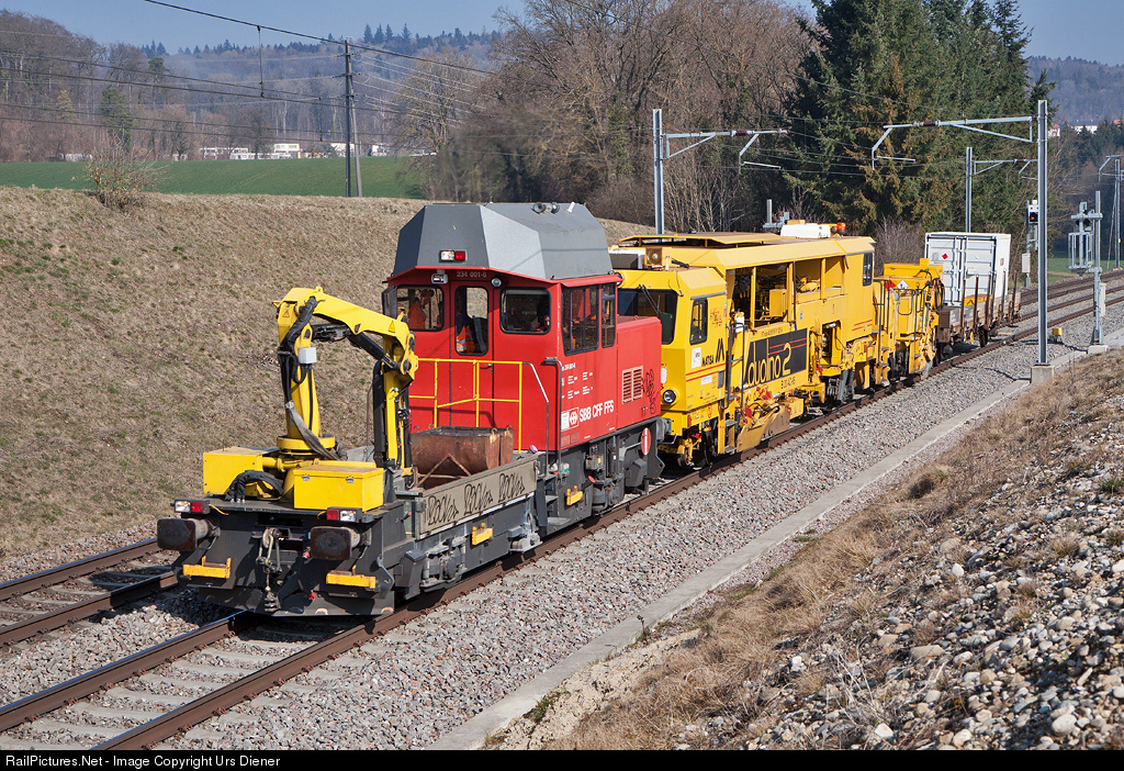 MOW vehicle Tm 234 001 of SBB Infra is pulling the Sersa ballast tamper machine VTmas 40 85 95 81 925-6 and an material flat car.