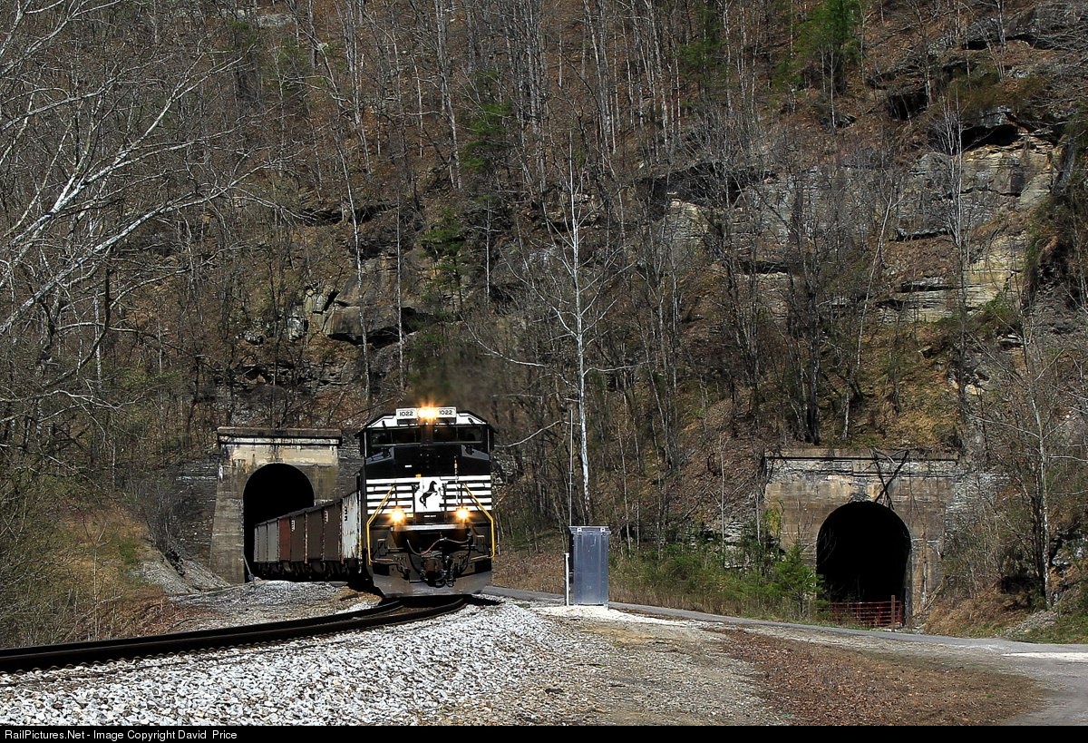 | SD 70ACE leads a coal drag through the tunnel section of the Kenova District on a beautiful "near" spring afternoon in the remote hills of southern West "By God" Virginia. Note the original N&W tunnel abandoned in place, & still used by the locals.. |