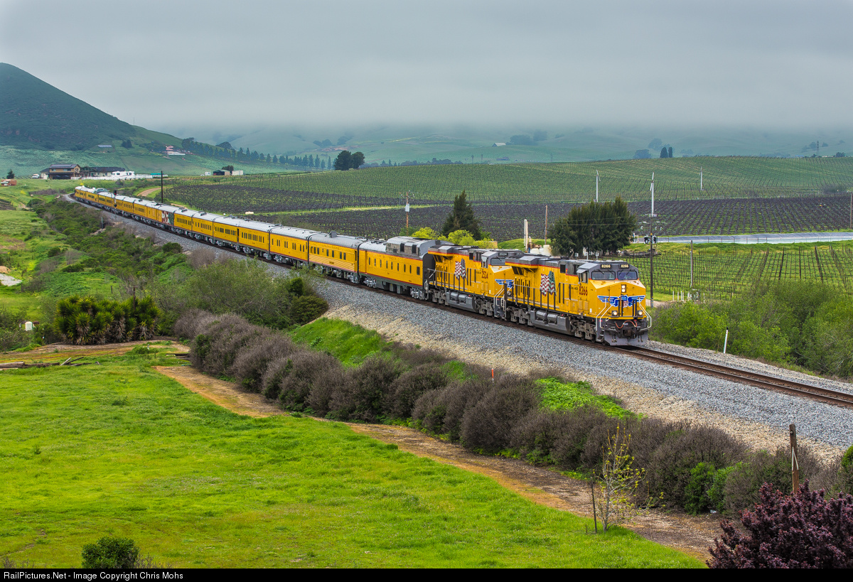 | Union Pacific's Board of Directors Special has now become a Engineering Department Special. The fog has settled on the Coast Route, as the Special makes it's way through the Wine growing region of the Edna valley. |