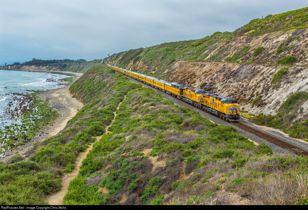 | The Union Pacific Board Of Directors Special has become a Engineering Department Special. The sun is trying to break through, but the fog is very persistent, as the Special traverses the Carpenteria Bluffs. |