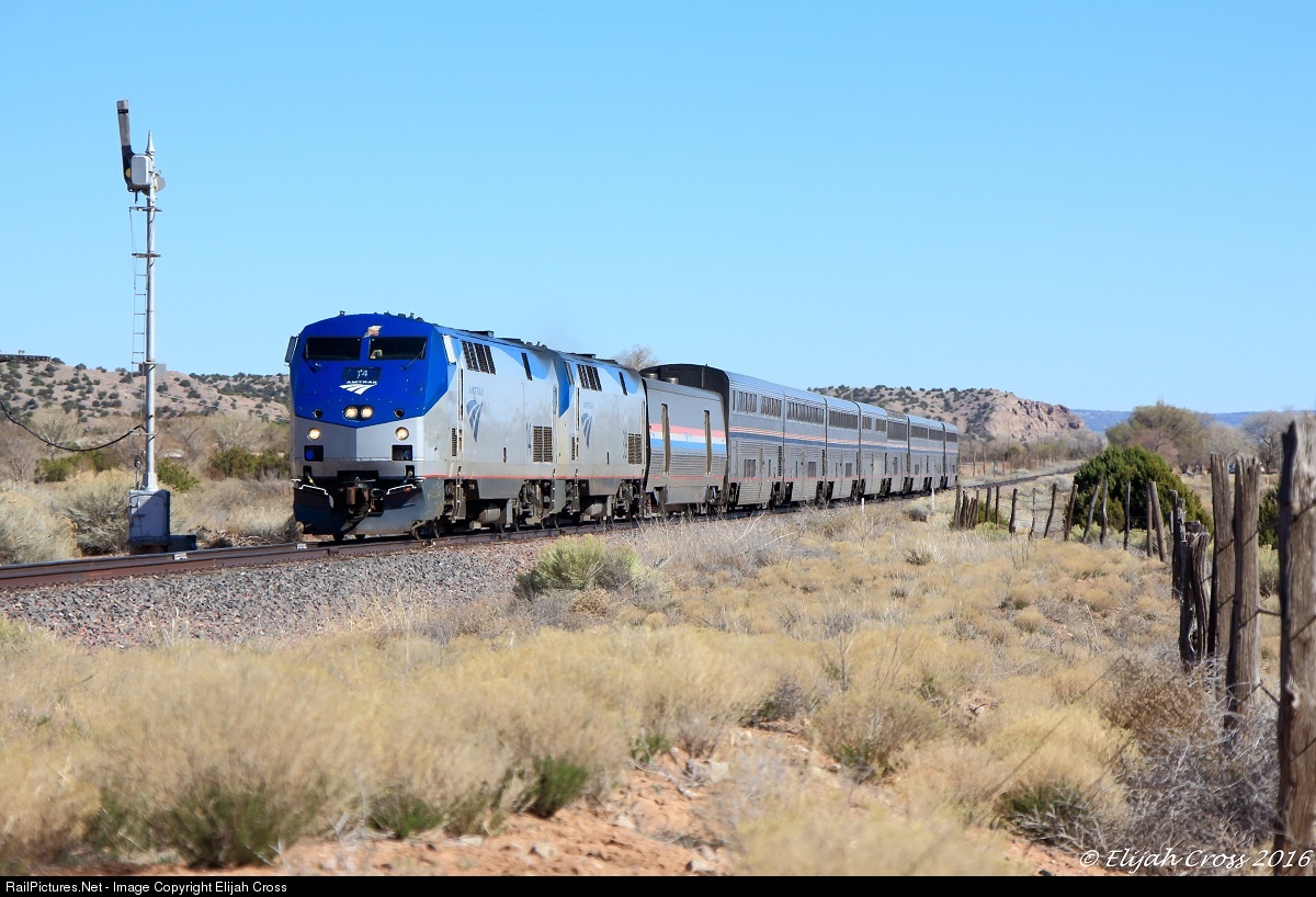 | Having spent the majority of the day traversing northern New Mexico, Amtrak's Southwest Chief #3 prepares to knock down it's final semaphore signal as it continues it's cross-country journey towards Albuquerque, NM. |