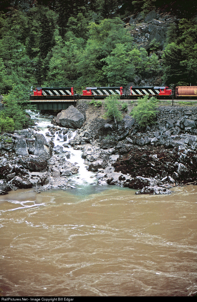 In a model railroad scene, CN 5314 leads two older SD40s repainted in the zebra scheme, crossing a short deck girder bridge over a water fall of a mountain brook spilling into a muddy Fraser River near Yale, BC. Wet spring weather has plenty of muddy water flow in the normally blue-green river. That rock in front of the bridge seems out of scale!
