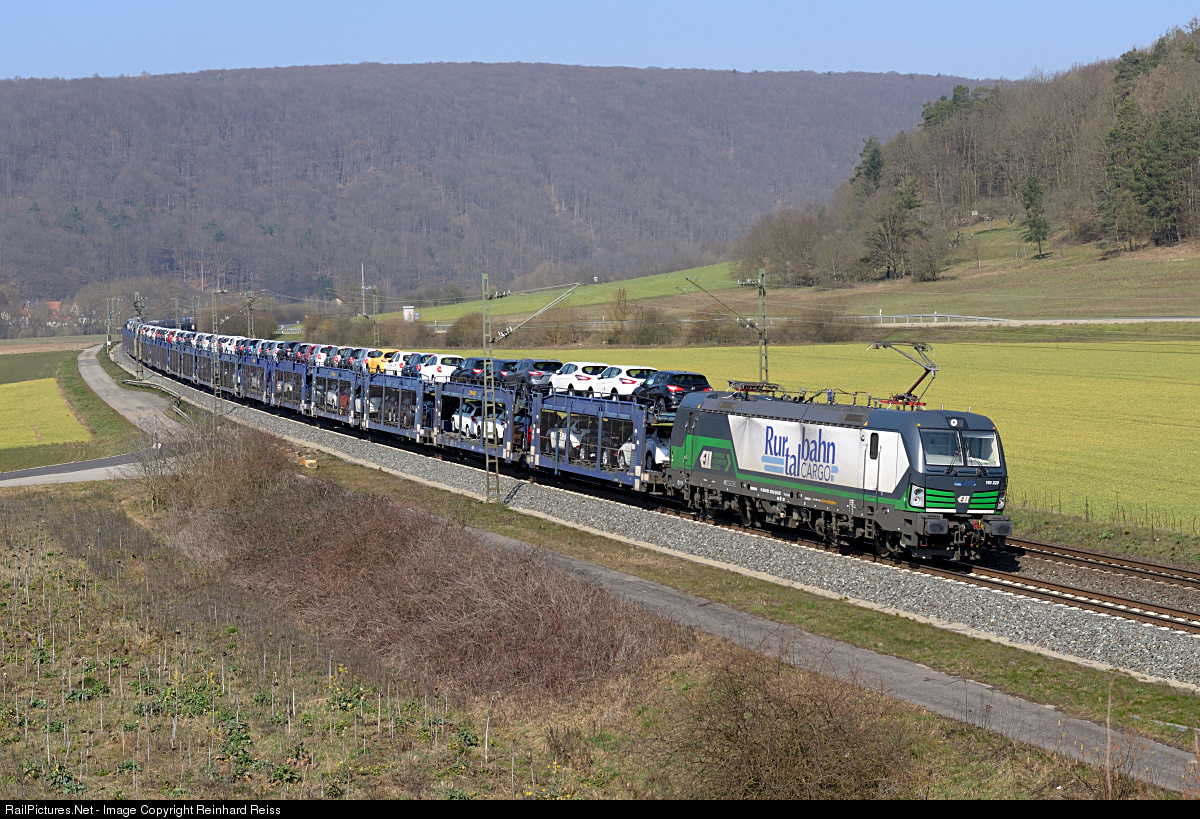 Rurtalbahn Cargo 193 229 heads a southbound auto train near Wernfeld