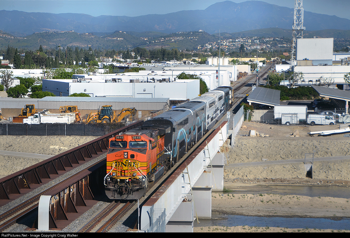 With Saddleback looming in the distance, Metrolink train 686 (Los Angeles to Irvine) departs the Anaheim Regional Transportation Intermodal Center (ARTIC) and crosses the Santa Ana River, entering the city of Orange in the process. Metrolink F59PHI 887 is up front, and shoving on the rear is BNSF Railway AC4400CW 5649. (Because of doubts about the crashworthiness of their Hyundai Rotem cab cars, Metrolink has leased a batch of BNSF freight diesels.)
