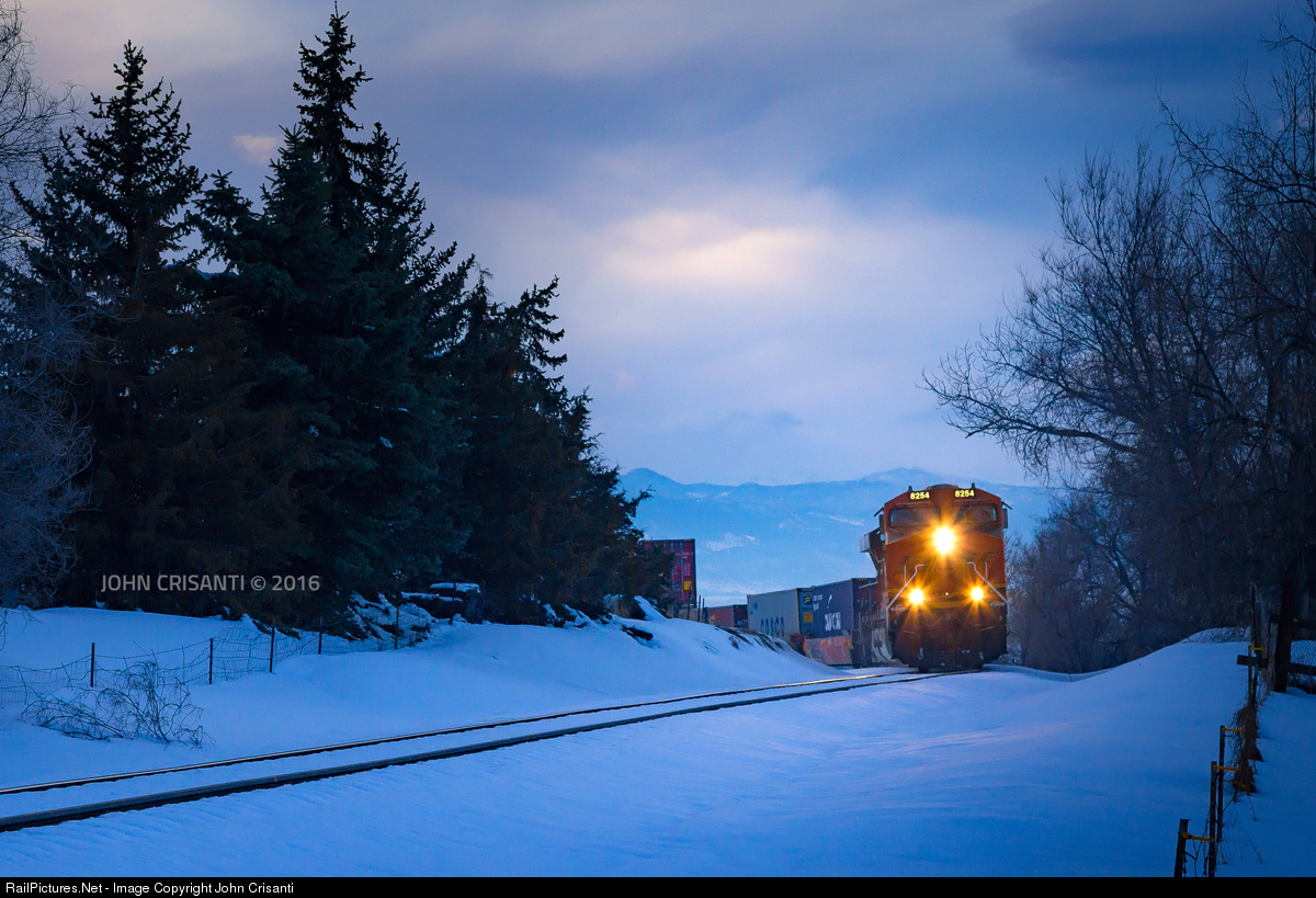 The sun has gone down for the day as BNSF ES44C4 No. 8254 leads the Tacoma, Washington to Omaha, Nebraska stack train up to the top of the Burkes Hill, which is a 2-percent grade, on a cold evening on March 24, 2016.