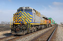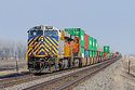 A clean and colourful CREX ES44AC idles at Mile 38 of BNSF's Jamestown Sub with a stack train waiting for a new crew and a parade of eastbounds to arrive off of the single track.