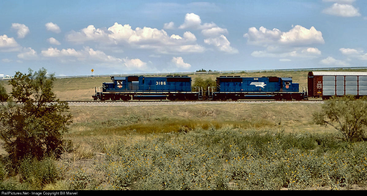 This is still mesquite and prairie grass in August, 1977, as Missouri Pacific 3186 heads to Fort Worth with another load of autos from the General Motors plant in Grand Prairie. The second unit, 3140, proudly wears on its flanks the road’s handsome “Screaming Eagle” logo, created in 1964 to distinguish turbocharged power, but the lead unit got a smaller version under the cab window with the eagle superimposed over the road’s famous red buzzsaw emblem. The turbocharged SD40-2’s, 1975 and 1974 products of EMD, are running on Texas & Pacific track laid down a little over one hundred years ago, in 1876.