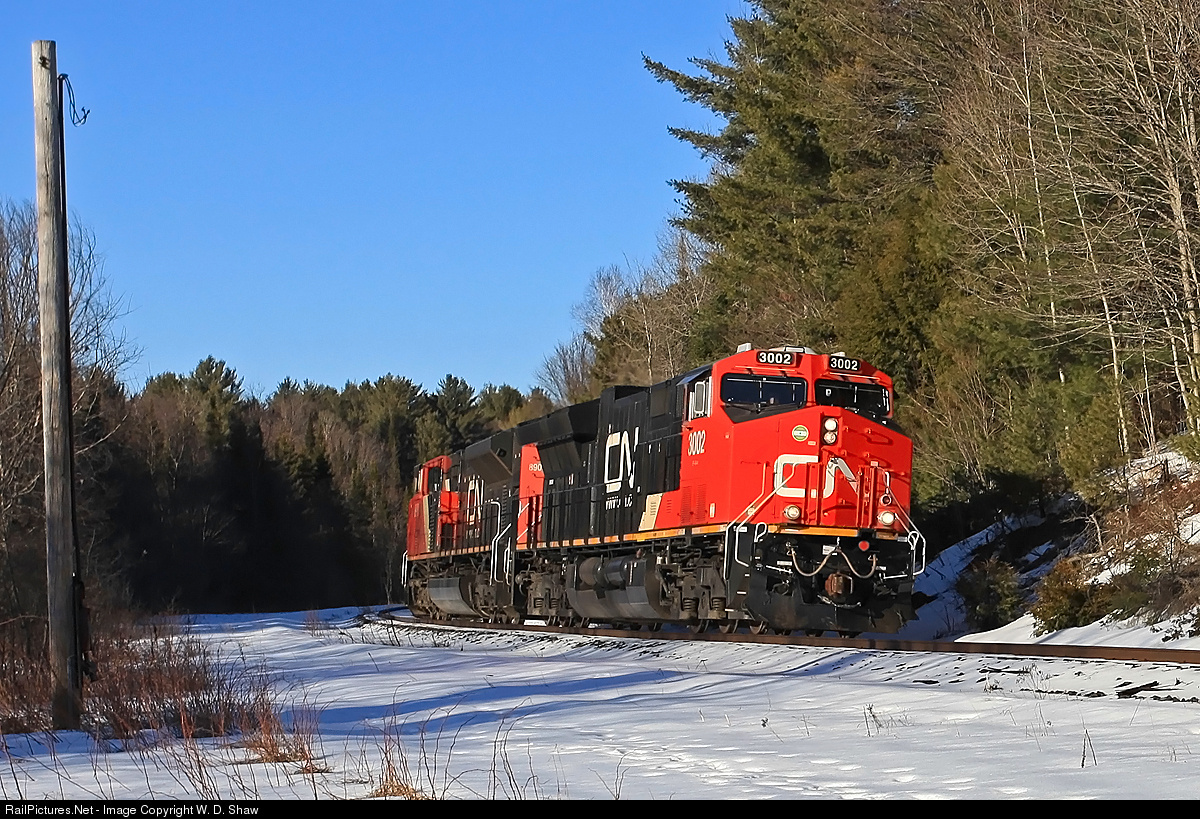 A pair of new-ish units, CN 3002 and 8900 roll southbound light through Utterson on an early spring afternoon. The utility pole and empty roadbed in the foreground bear witness to what once was a fairly busy rural setting which was home to a station and a couple of outbuildings, a station track and another track which doubled as a siding/RIP track (note the welding plug below the junction box on the pole). |